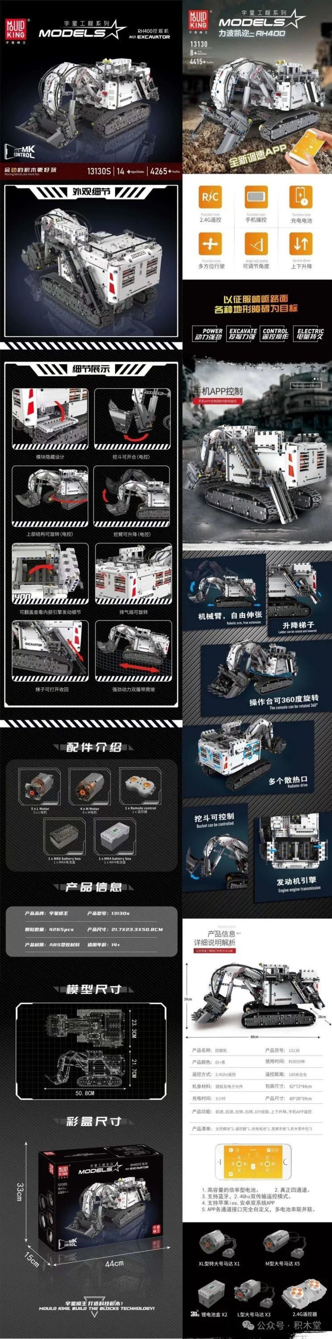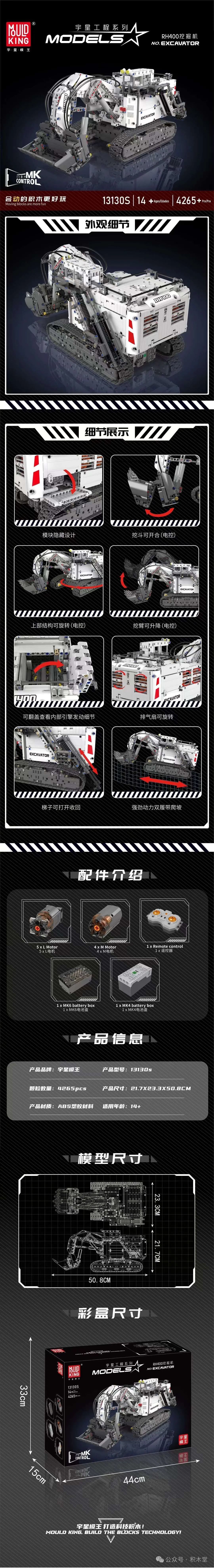 宇星模王7月的第一波新品有4款新品。 基本上都是推荐的!都可以买! 我最喜欢肯定是1:8车,大砖车,大海盗船。 那这次更新的产品怎么样,跟上MAX的步伐,带你看一下。 let's go 宇星模王 货号:13190,颗粒数:4070+pcs,莱肯。 高德斯零件,酷砖家系列,标注尺寸为:52.3*24.4*13.5cm。 不确定,但可能是标配动态版本,电机组包括:伺服电机*1,L马达*4,XL马达*2,六通道锂电池*1,线性遥控器*1,碳纤维配件一批*1。 以往的1:8跑车,在电机的宣传位置是写(需另购),但这次的莱肯是像工程车一样,直接写了配件,那这车,就可能是标配动态,那价格就很顶了。 不过,从体验感觉来说,我玩过这么多年的1:8大车,有底盘升降功能的我都推荐大家买动态,那体验感是不同的。 莱肯就是速度与激情里飞大厦那台,全球只有7台那个。  如果我买了,我一定不贴车前盖的贴纸!  百变创意系列 宇星模王 货号:10031,颗粒数:1603+pcs,浮影。 高德斯零件,酷砖家系列,标注尺寸为:35.3*17*9.8cm。 好久没见Firas的作品了。 根本都不用介绍,他的作品,就一个字:冲!!!! 但这个车标,让我有一种黑帮老大定制车的感觉。 车标就不能开个模?我还是最想念雷尔那个开模的女神像车标。  工程系列 宇星模王 货号:13130S,颗粒数:4265+pcs,RH400挖掘机。 高德斯零件,标注尺寸为:50.8*21.7*23.3CM。 标配动态版本,电机组包括:L马达*5,M马达*4,四通道锂电池*1,六通道锂电池*1,线性遥控器*1。 这是13130的升级版,我开始以为升级会升为霍尔电机。 但看电机图,从原来的2个4通换成1个6和1个4通的,马达的使用也不同。 最神奇是尺寸,颗粒数多了,但成品尺寸小了,证明什么?重新设计?大臂弯曲角度更大? 我还是最喜欢第一版的竞速挖机。  对比图  宇星模王 货号:13197,颗粒数:4364+pcs,飞跃的荷兰人号。 高德斯零件,标注尺寸为:84*31*58.6cm。 话说,这和13138的区别是什么?大家来找茬吧。 其实最明显应该是船首部分吧,以前的是一个类似大嘴的造型,新的这个就更加像普通的船。 其次是整体感觉没之前的绿植那么多,船长室外的火把多了。 颗粒数从3653pcs升级到4364pcs。  对比图  总的来说,这次的四款新品都非常适合资深玩家,在这个7月的暑假中,它们都是可以让你静下心来体验几天的产品,可以冲!