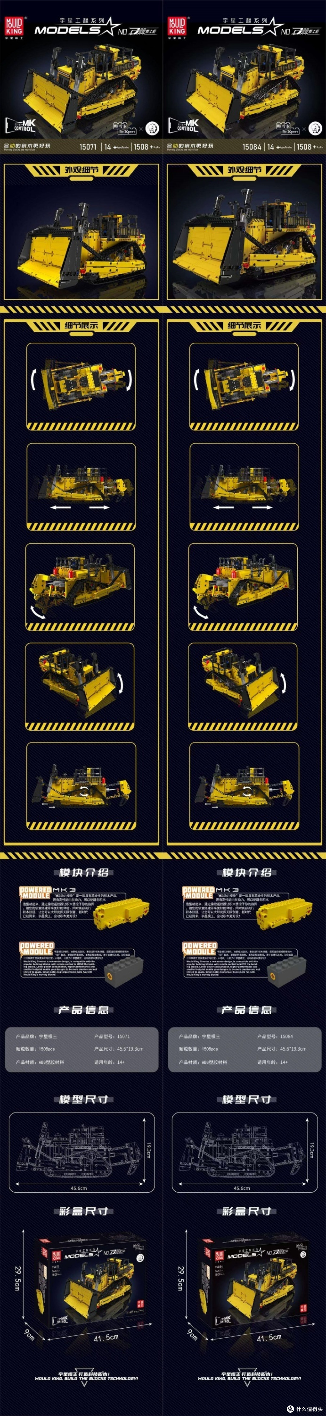 工程系列 宇星模王 货号:15084,颗粒数:1508+pcs,D11推土机。 高德斯零件,酷砖家系列,标注尺寸为:45.6*19.3CM。 我。。。。。觉得。。。老板是忘记之前出过了?还是。。。 2023年9月的15071,和这个是一毛一样的。 不太懂,但大受震撼!  对比图  总的来说,这次的吊车,大车,砖车都非常好,可以冲一下。 另外的推土机我怀疑是发错了,哈哈。
