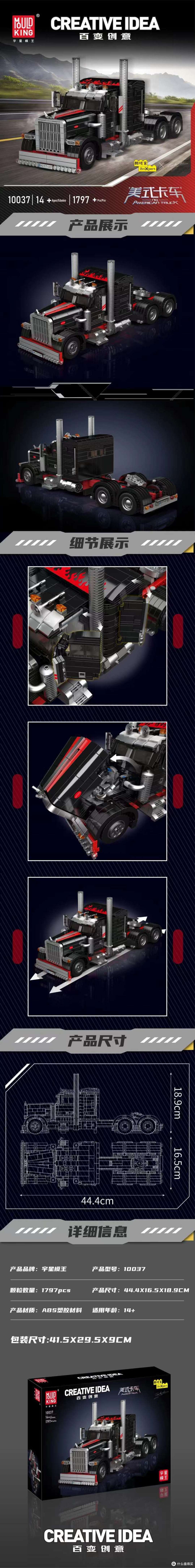 百变创意系列 宇星模王 货号:10037,颗粒数:1797+pcs,美式卡车。 高德斯零件,酷砖家系列,标注尺寸为:44.4*16.5*18.9CM。 根本不用介绍,firas的东西,都是可以冲的。 这个有没有后面的拖板?